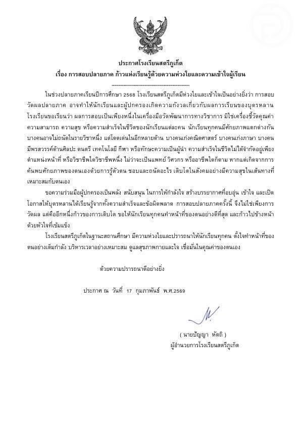 مع اقتراب الامتحانات النهائية، تُركّز العديد من المدارس على الدرجات والتصنيفات والمنافسة. لكن مدرسة فوكيت ويتايالاي اختارت مسارًا مختلفًا. ففي رسالةٍ مُلهمةٍ للطلاب وأولياء الأمور، ذكّرت المدرسة مجتمعها بأنّ نتائج الامتحانات ليست سوى مقياسٍ واحدٍ للتعلم، ولا تُحدّد قيمة الطالب أو إمكاناته أو نجاحه المستقبلي. إنها وجهة نظرٍ جديرةٌ بالتقدير.